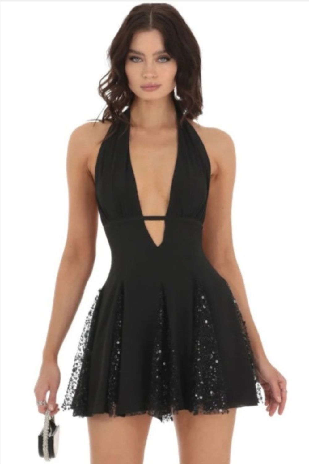 Dramatic, flirty, and undeniably glamorous, this black halter neck mini dress is designed to make a statement. Featuring a deep plunging neckline with a delicate center bar detail, it accentuates the neckline while the fitted bodice sculpts the waist for a striking silhouette. The flared skirt is finished with a soft, textured tulle overlay that adds volume, movement, and a touch of sparkle. Perfect for cocktail parties, nights out, or special occasions, this dress pairs beautifully with heels and a clutch for an effortlessly captivating evening look.