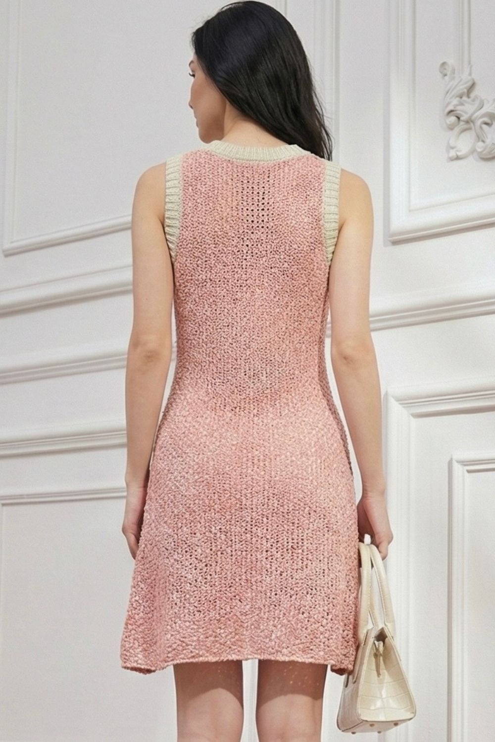 Soft, feminine, and effortlessly stylish, this blush pink textured knit mini dress is a chic addition to your wardrobe. Designed with a sleeveless silhouette and a classic round neckline, it features contrasting ribbed trims that add subtle structure and visual interest. The delicate open-knit texture creates a lightweight, breathable feel while gently contouring the body for a flattering fit. Its softly curved hemline enhances movement and modern appeal. Perfect for brunch dates, daytime outings, or summer gatherings, this dress pairs beautifully with neutral heels or flats and a structured handbag for an elegant, polished look.