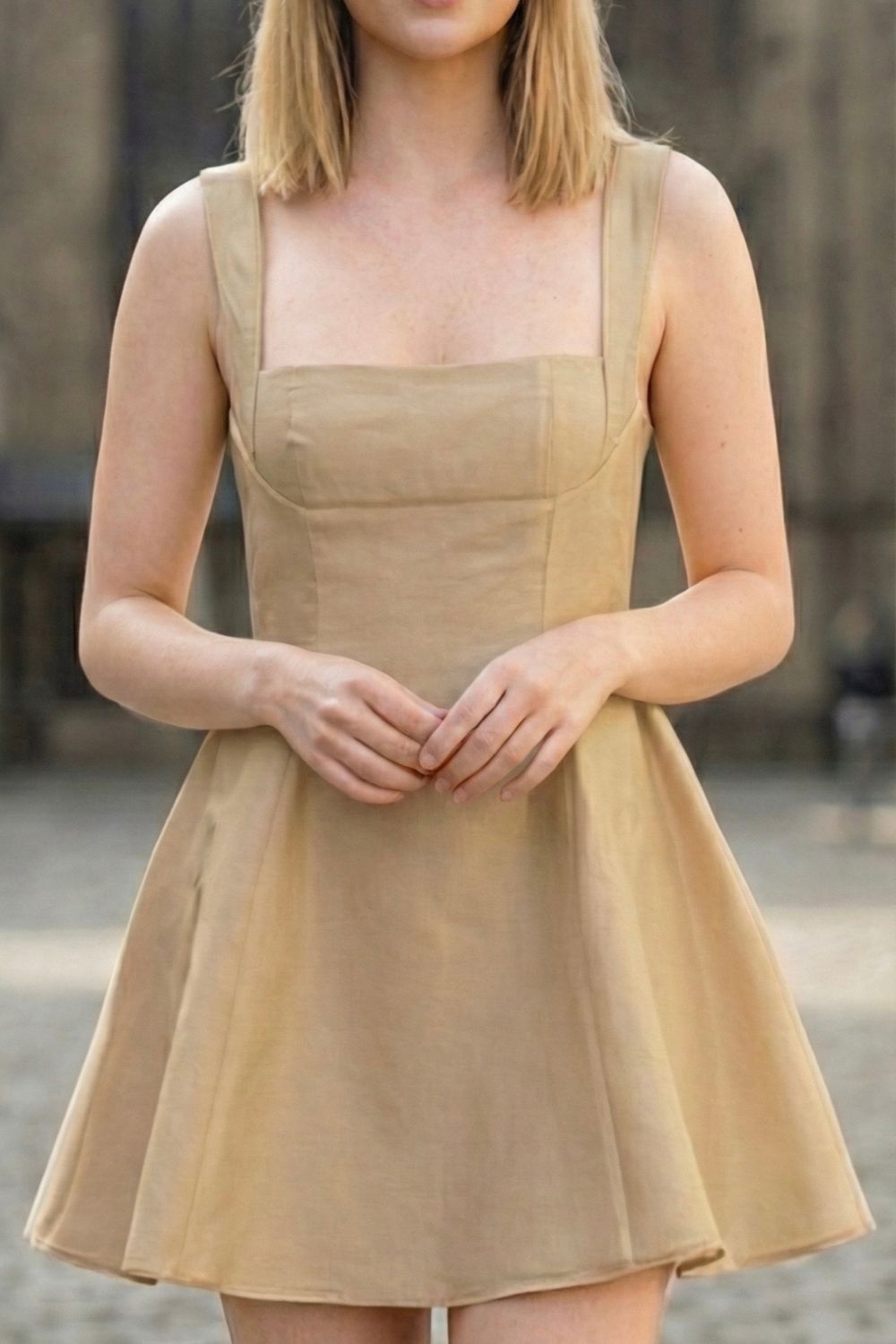Step into effortless sophistication with this chic beige A-line mini dress. Designed with a flattering square neckline and wide shoulder straps, it beautifully frames the décolletage while offering comfortable support. The structured bodice gently cinches the waist, flowing into a softly flared skirt that creates a graceful, feminine silhouette. Crafted in a smooth, lightweight fabric with a subtle sheen, this dress is perfect for brunches, summer parties, resort getaways, or elegant daytime events. Pair it with nude heels and delicate jewelry for a timeless, polished look.