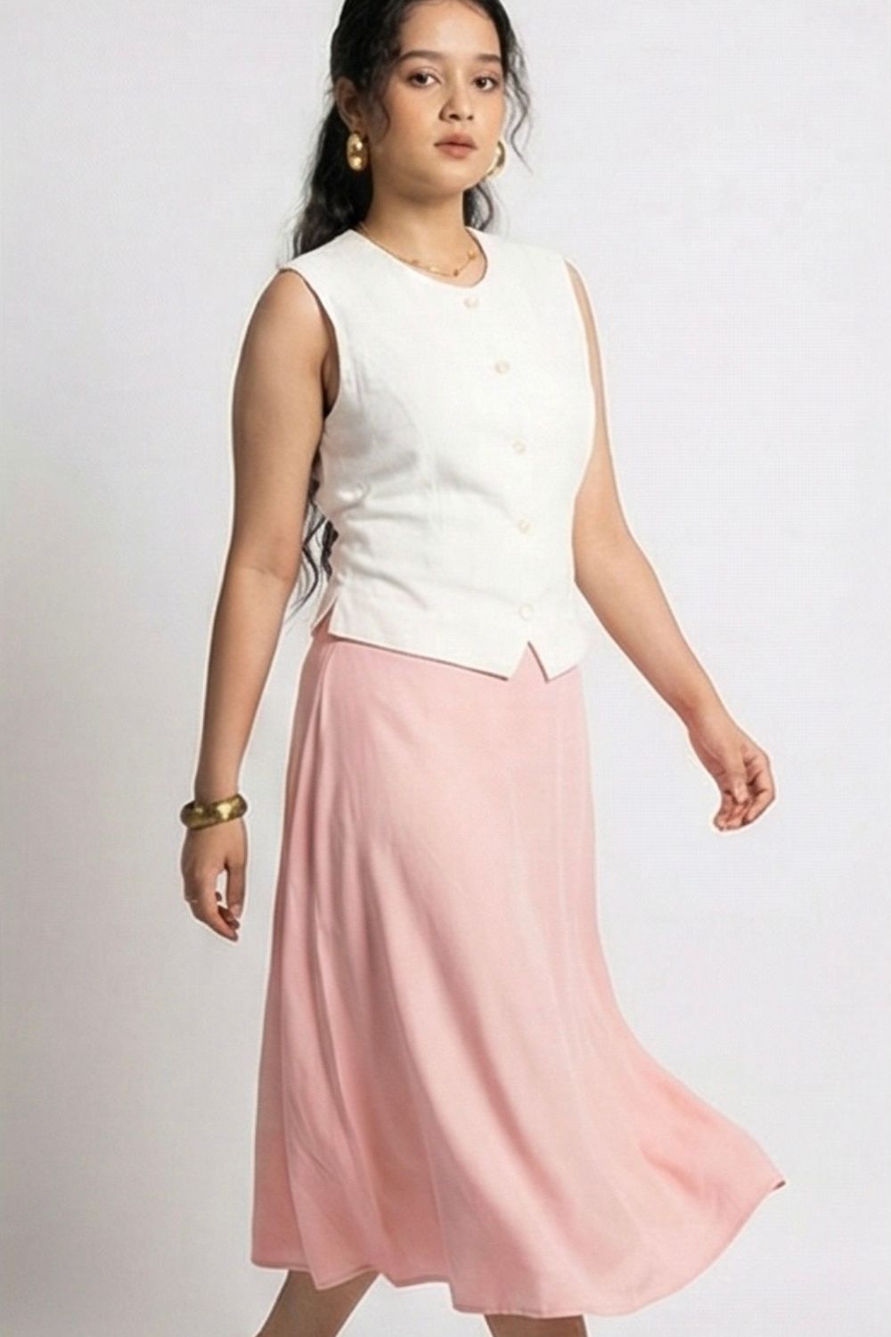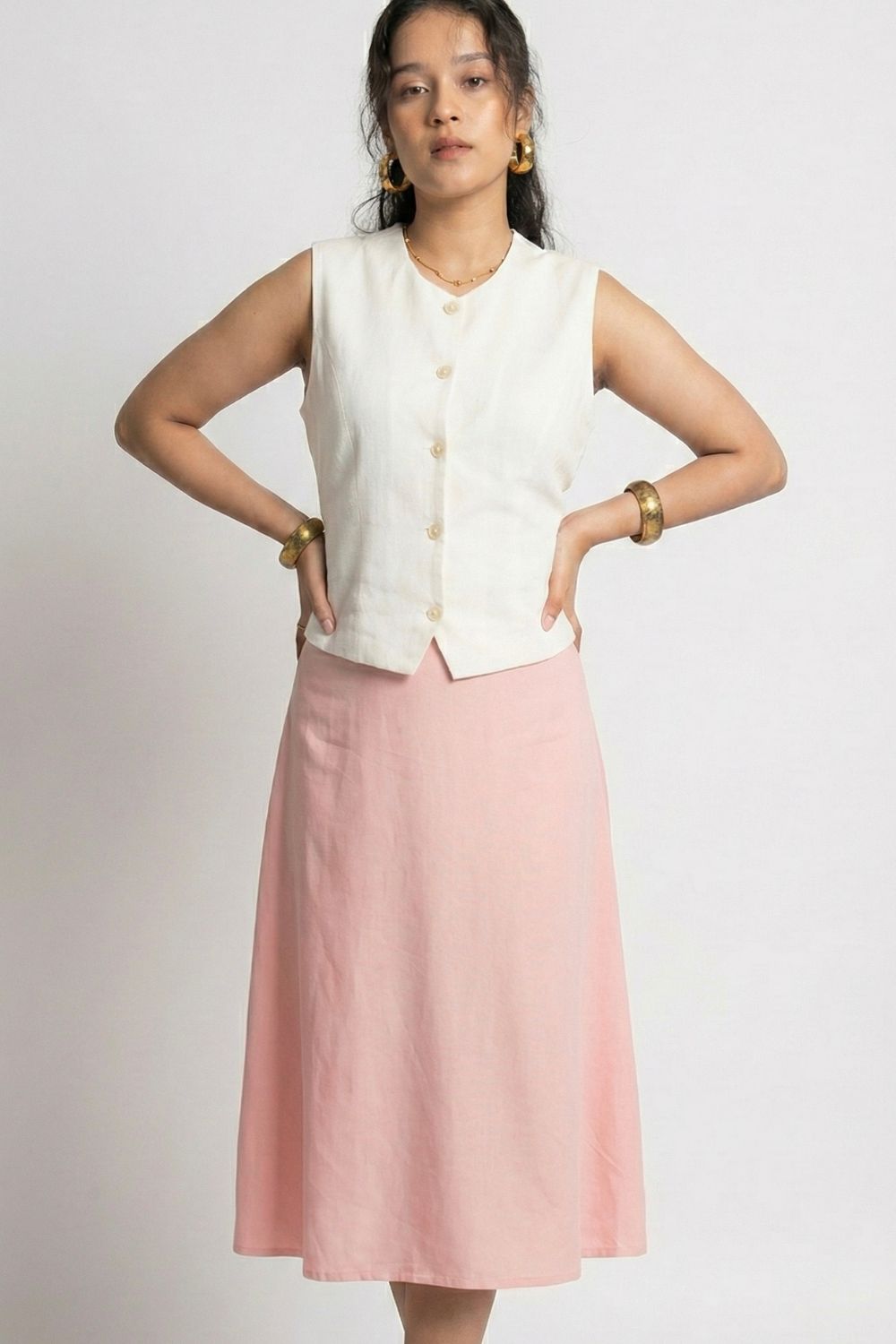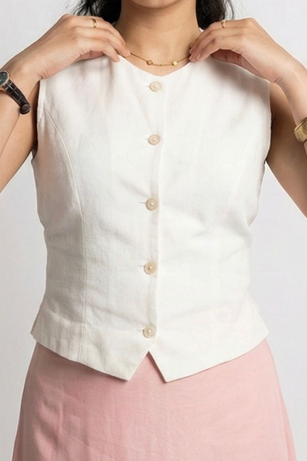 Light, refined, and effortlessly elegant, this ivory sleeveless vest is a timeless warm-weather staple. Crafted from breathable linen-blend fabric, it features a clean V-neckline and a classic button-front design that creates a softly tailored silhouette. The structured yet relaxed fit flatters the waist while maintaining all-day comfort. Perfect for pairing with skirts, trousers, or denim, this versatile vest transitions seamlessly from casual daytime styling to polished resort or vacation looks.