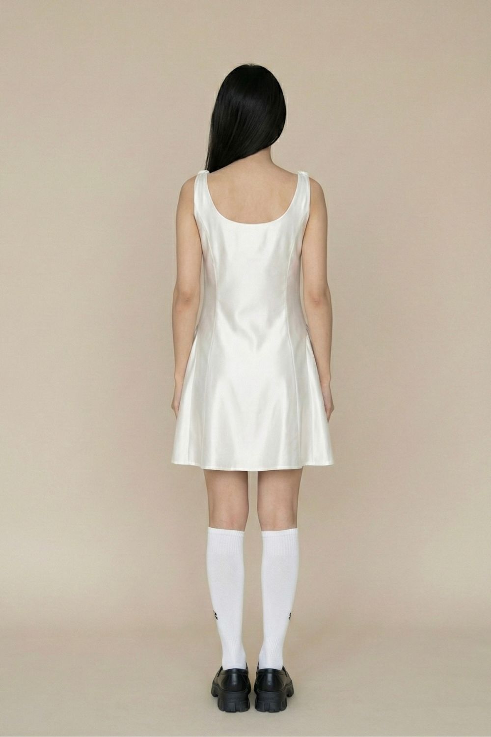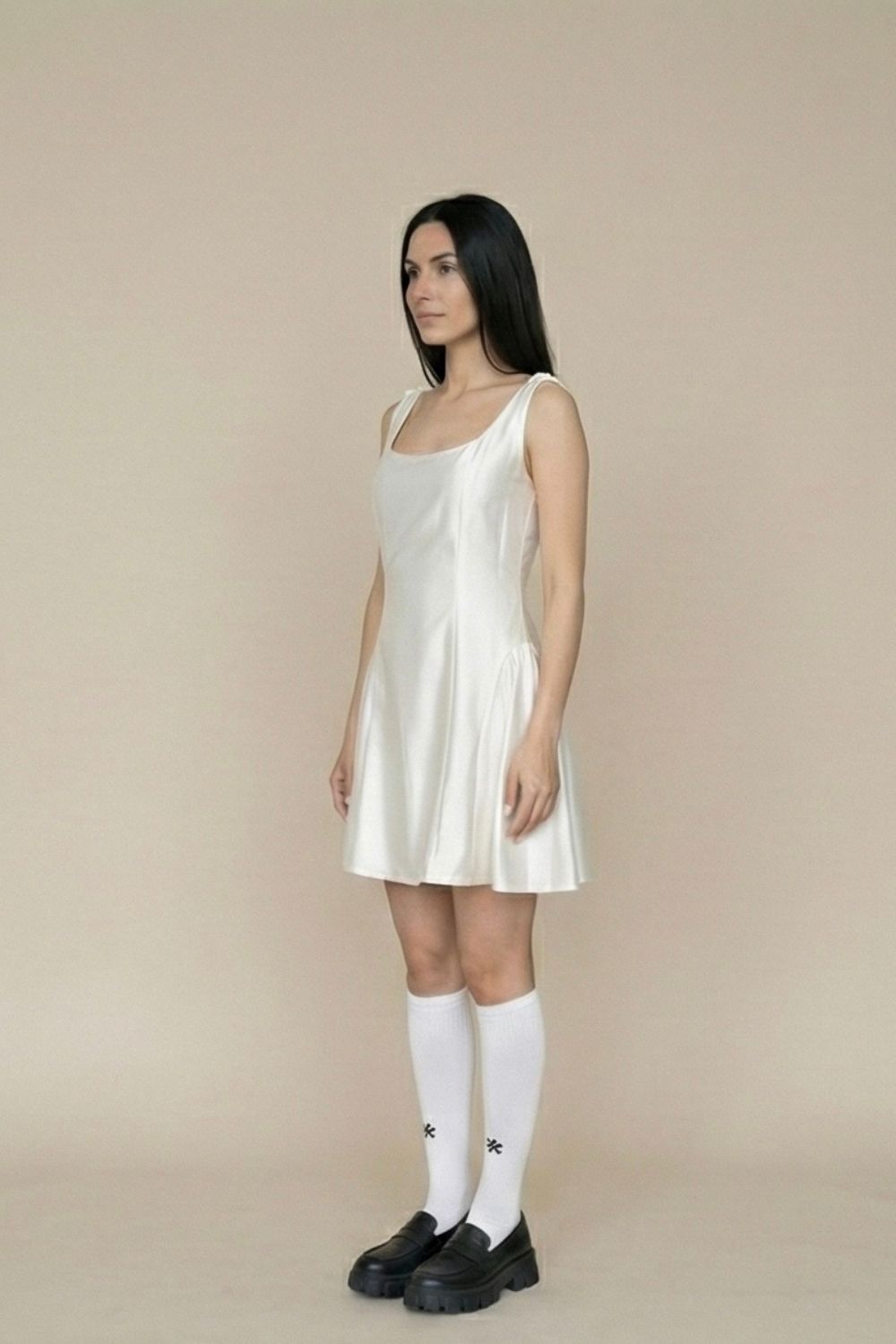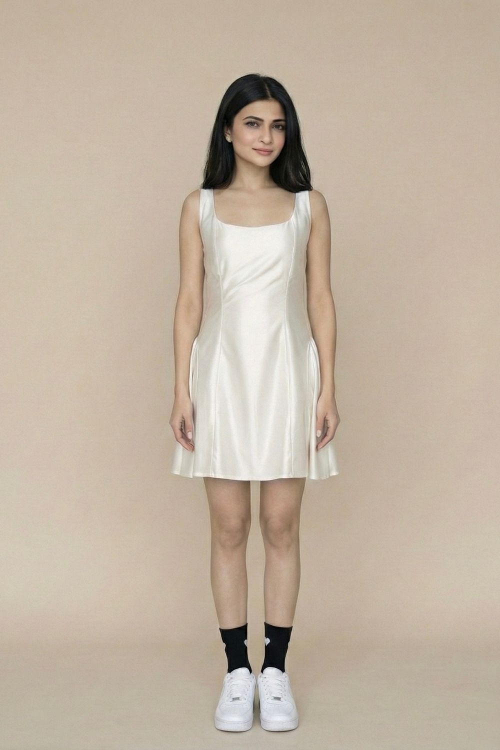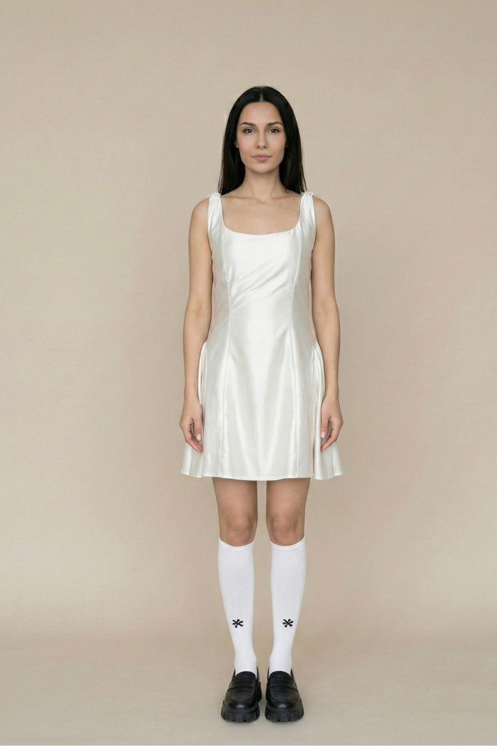 Graceful and timeless, this ivory satin mini dress exudes understated elegance. Designed with a classic square neckline and wide shoulder straps, it offers a structured yet feminine silhouette. The softly tailored bodice gently shapes the waist before flowing into a subtle A-line skirt, creating effortless movement and a flattering fit. Crafted from smooth satin with a delicate sheen, this versatile dress is perfect for daytime events, bridal celebrations, or chic evening styling. Pair it with heels or loafers for a polished, modern look that feels both refined and fresh.