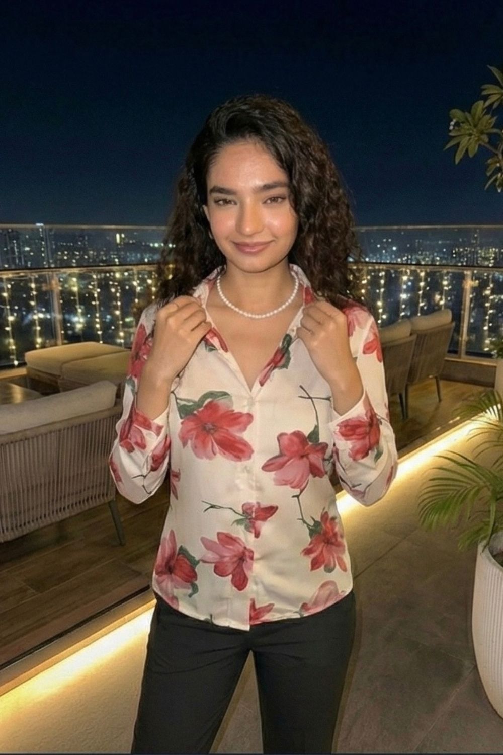 Fresh, feminine, and effortlessly elegant, this white satin shirt features a bold red floral print that adds a vibrant touch to classic tailoring. Designed with a smart collared neckline and a button-down front, it offers a polished yet relaxed silhouette suitable for both work and evening wear. The smooth satin fabric provides a soft sheen and fluid drape, enhancing comfort and sophistication. Perfect to pair with tailored trousers, skirts, or denim, this versatile floral shirt transitions seamlessly from office chic to dinner-ready style.